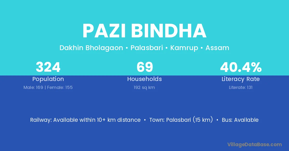 Palasbari (15 km) is the nearest town to Pazi Bindha village for major economic activities and is located approximately 15 km away.