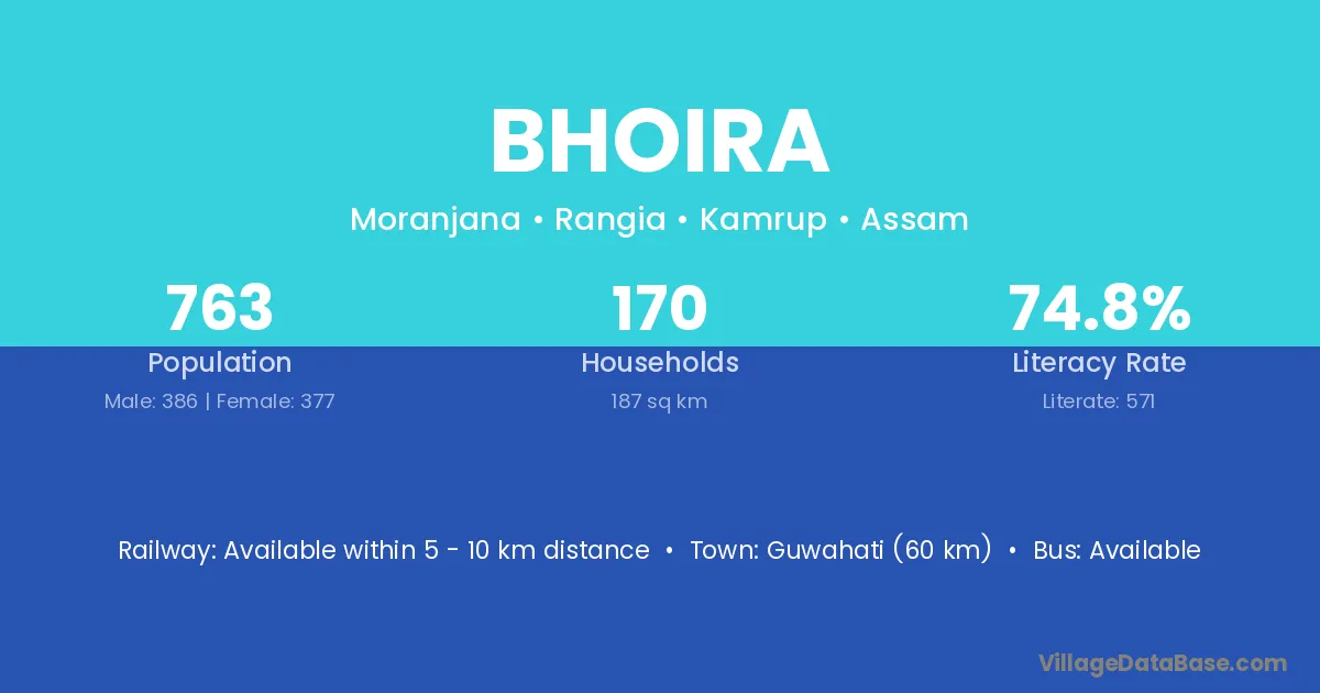 Guwahati (60 km) is the nearest town to Bhoira village for major economic activities and is located approximately 60 km away.