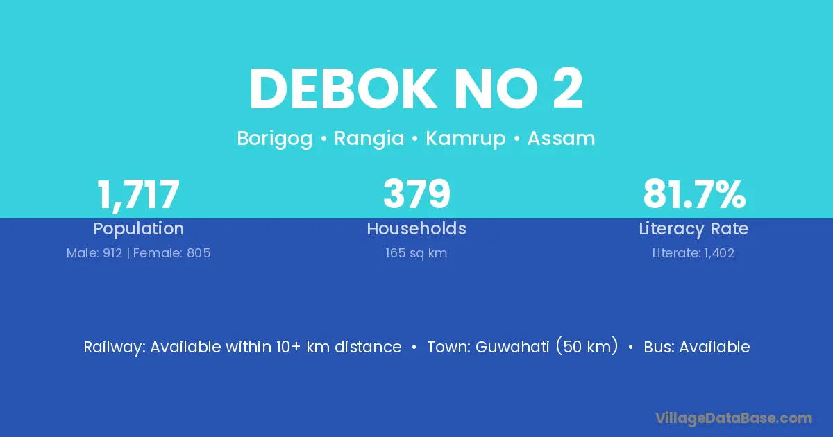 Guwahati (50 km) is the nearest town to Debok No 2 village for major economic activities and is located approximately 50 km away.