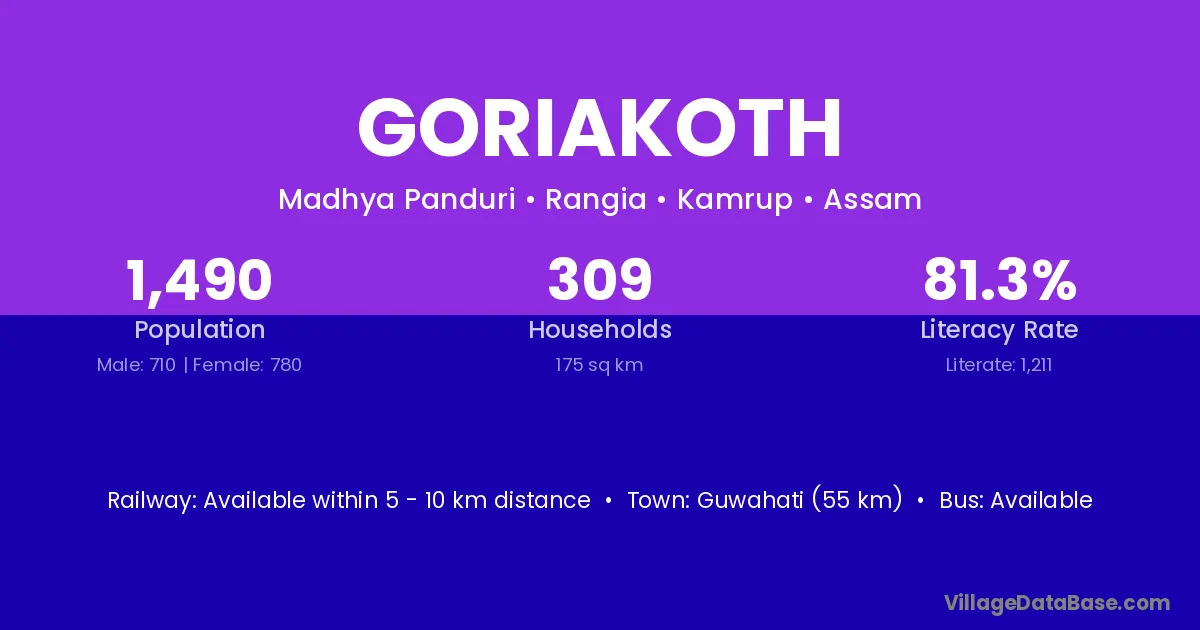 Guwahati (55 km) is the nearest town to Goriakoth village for major economic activities and is located approximately 55 km away.