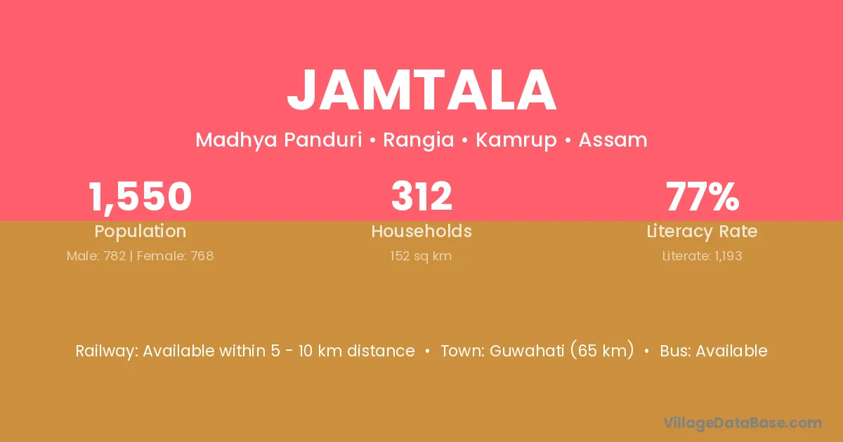 Guwahati (65 km) is the nearest town to Jamtala village for major economic activities and is located approximately 65 km away.