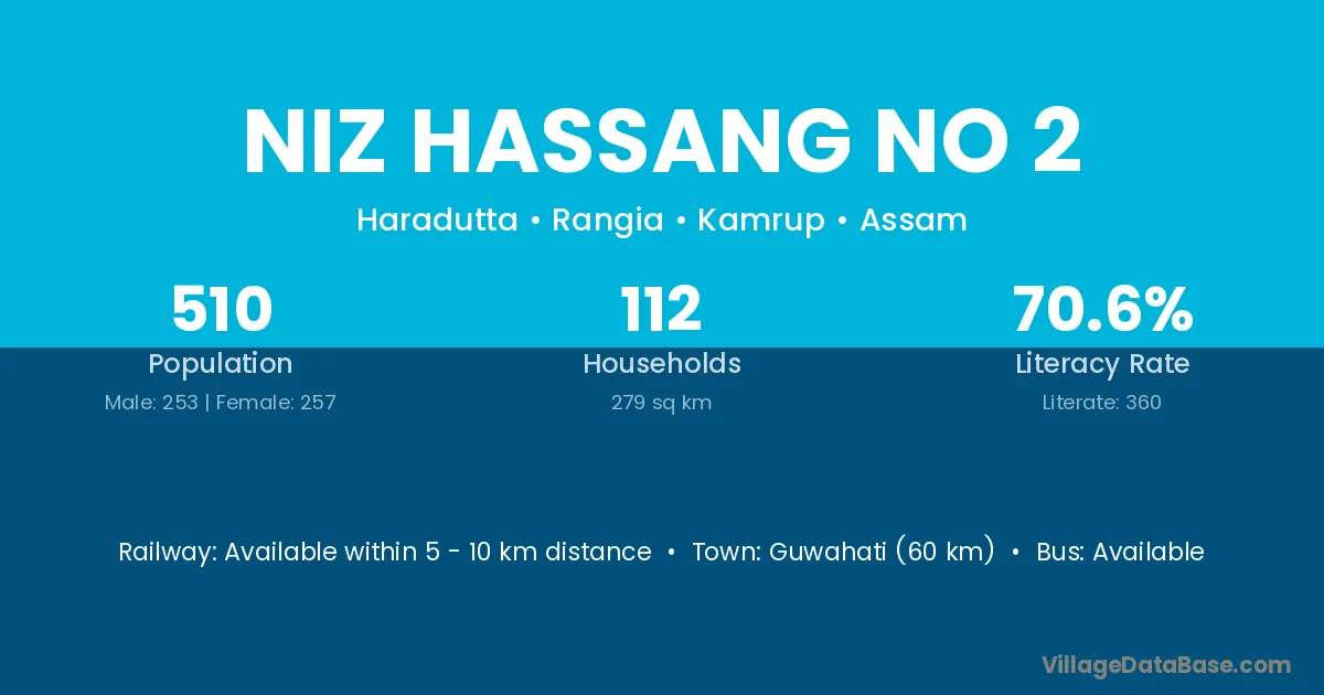 Guwahati (60 km) is the nearest town to Niz Hassang No 2 village for major economic activities and is located approximately 60 km away.