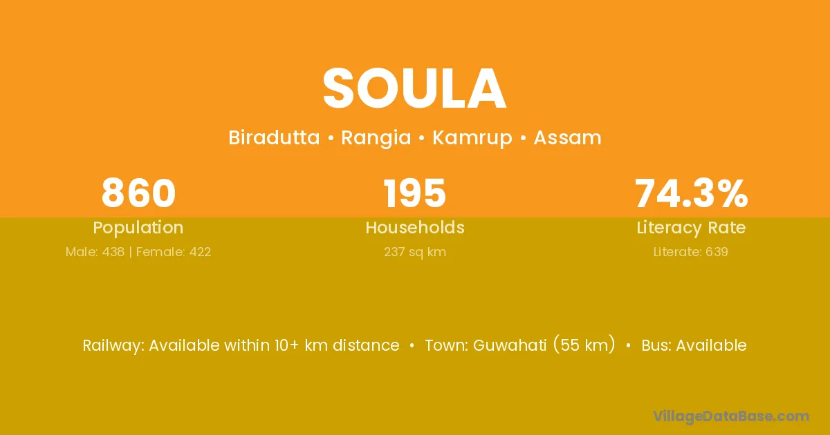 Guwahati (55 km) is the nearest town to Soula village for major economic activities and is located approximately 55 km away.