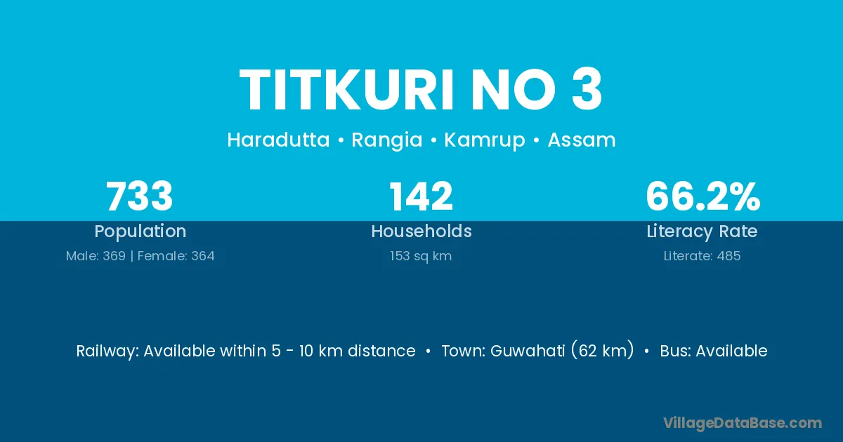 Guwahati (62 km) is the nearest town to Titkuri No 3 village for major economic activities and is located approximately 62 km away.