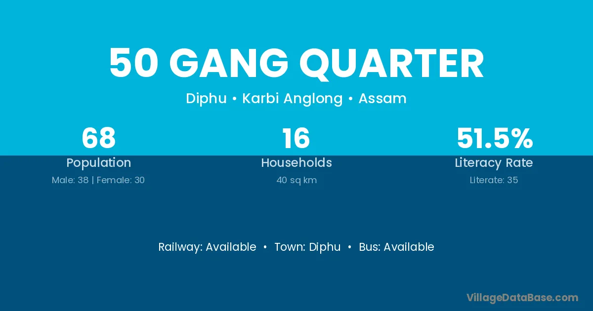 50 Gang Quarter village has a total population of 68 people, of which 38 are males and 30 are females.