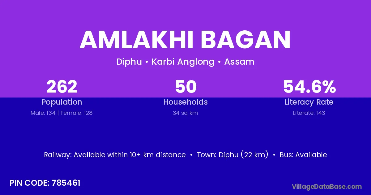 Diphu (22 km) is the nearest town to Amlakhi Bagan village for major economic activities and is located approximately 22 km away.
