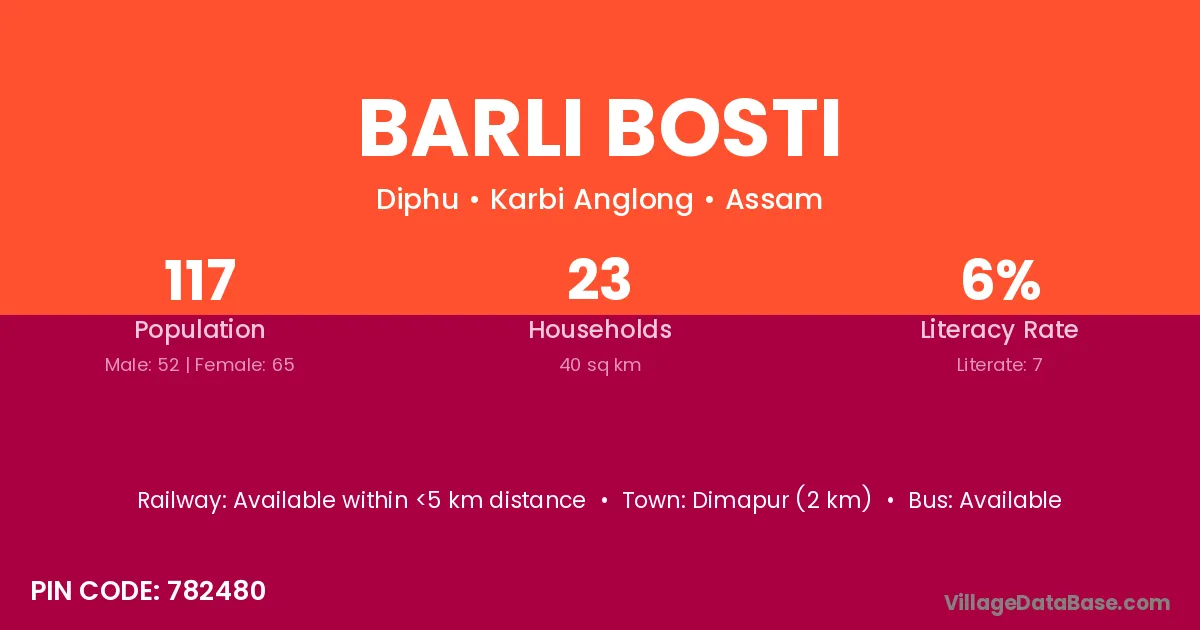 Dimapur (2 km) is the nearest town to Barli Bosti village for major economic activities and is located approximately 2 km away.
