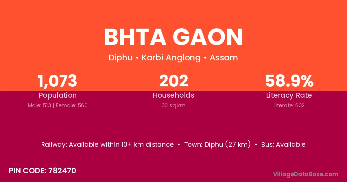 Diphu (27 km) is the nearest town to Bhta Gaon village for major economic activities and is located approximately 27 km away.