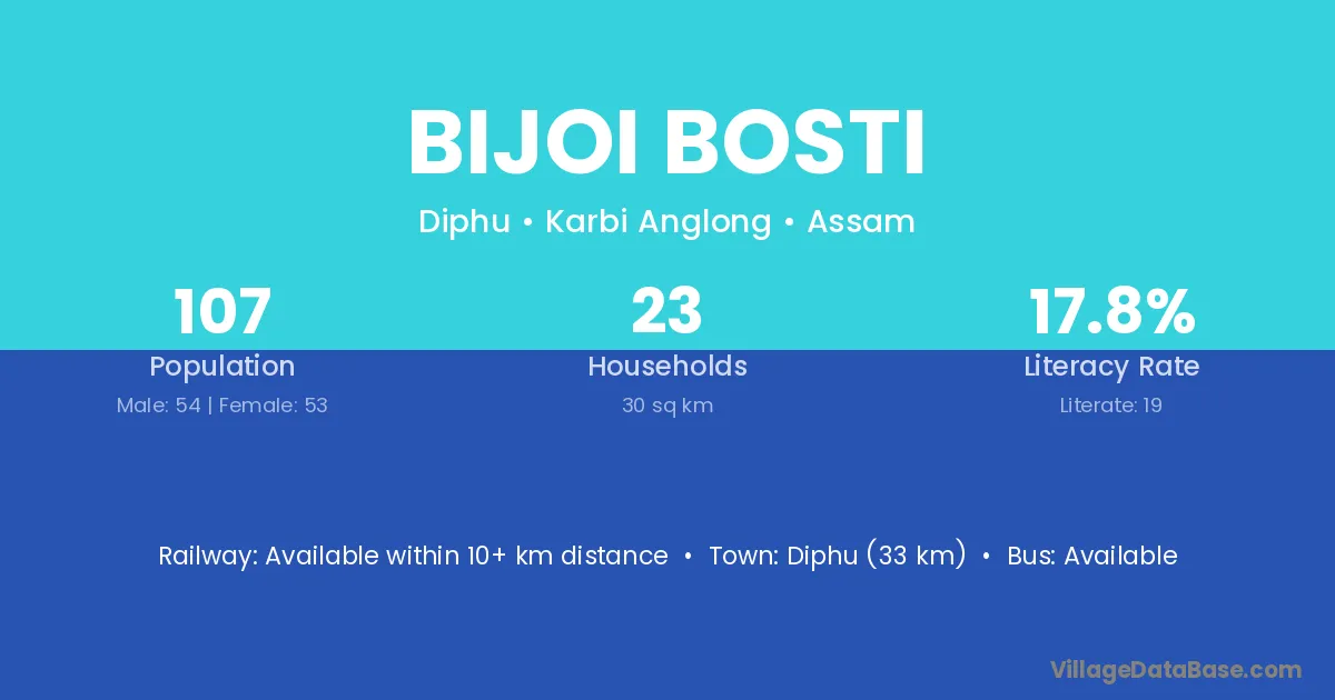 Diphu (33 km) is the nearest town to Bijoi Bosti village for major economic activities and is located approximately 33 km away.