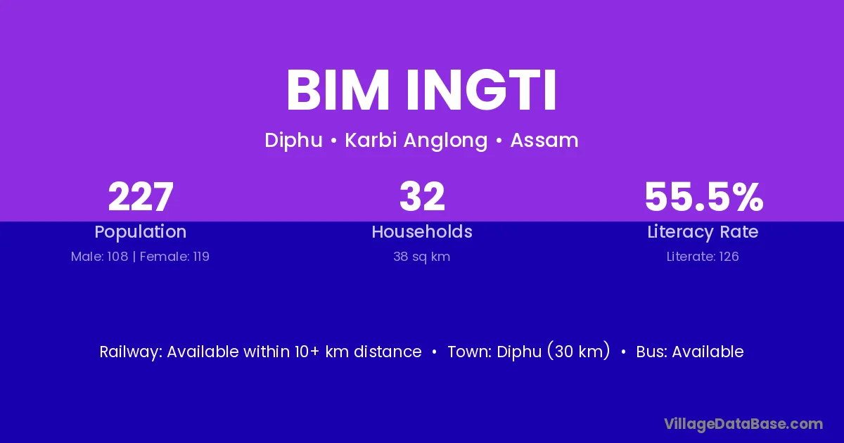 Diphu (30 km) is the nearest town to Bim Ingti village for major economic activities and is located approximately 30 km away.