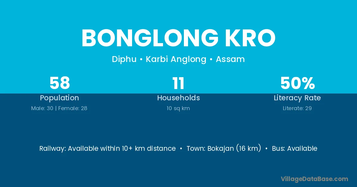 Bokajan (16 km) is the nearest town to Bonglong Kro village for major economic activities and is located approximately 16 km away.