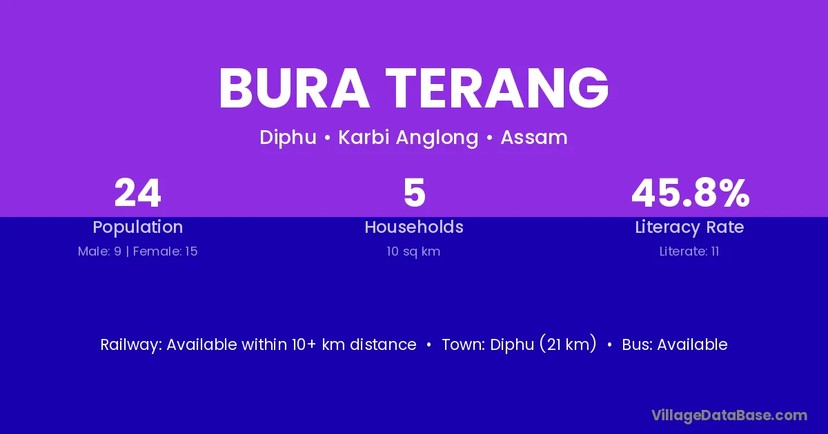 Diphu (21 km) is the nearest town to Bura Terang village for major economic activities and is located approximately 21 km away.