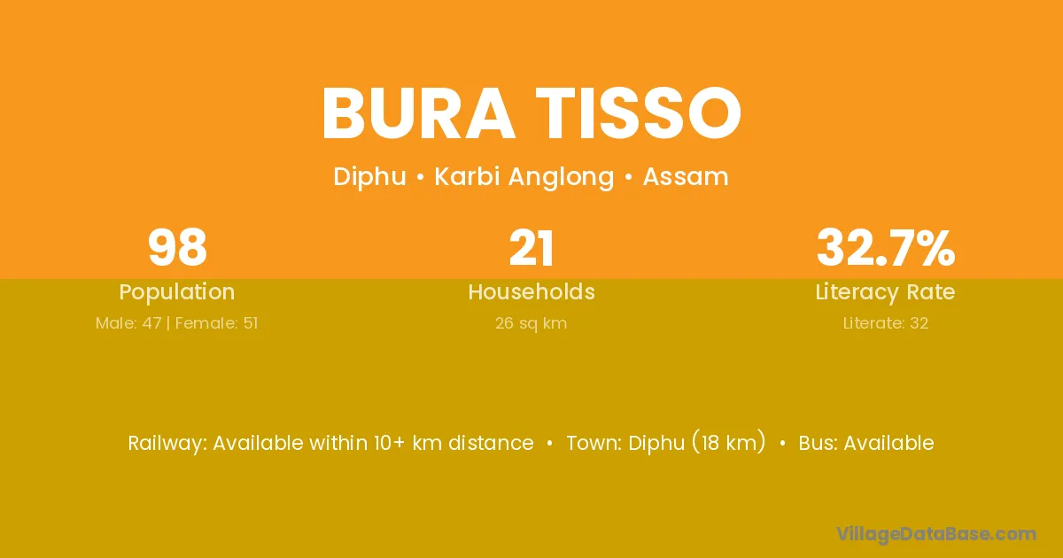 Diphu (18 km) is the nearest town to Bura Tisso village for major economic activities and is located approximately 18 km away.