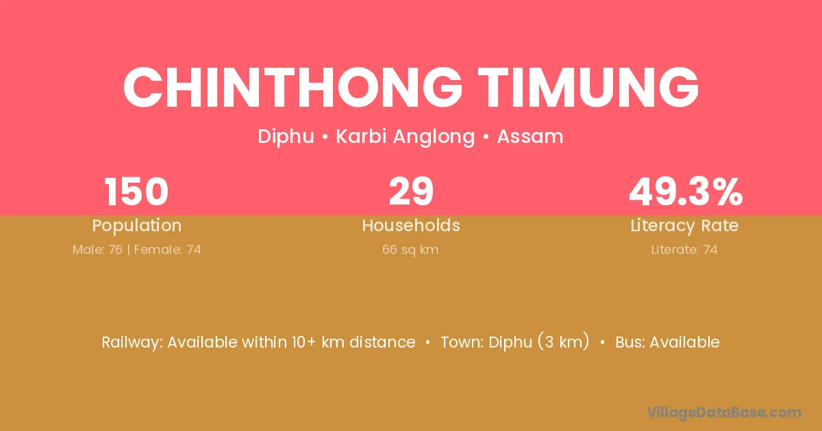 Diphu (3 km) is the nearest town to Chinthong Timung village for major economic activities and is located approximately 3 km away.
