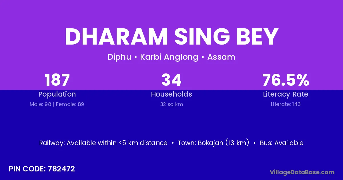 Bokajan (13 km) is the nearest town to Dharam Sing Bey village for major economic activities and is located approximately 13 km away.