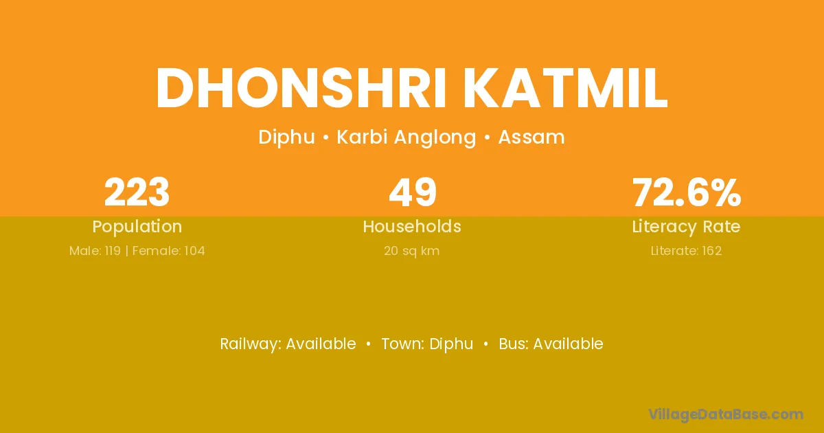 Dhonshri Katmil village has a total population of 223 people, of which 119 are males and 104 are females.
