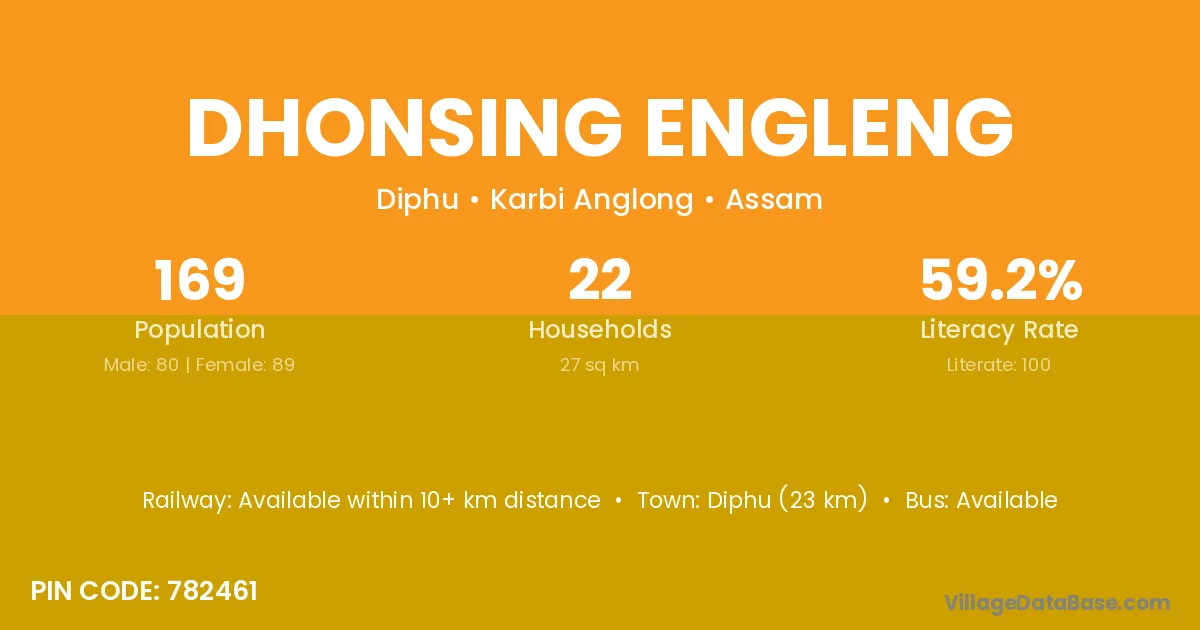 Diphu (23 km) is the nearest town to Dhonsing Engleng village for major economic activities and is located approximately 23 km away.