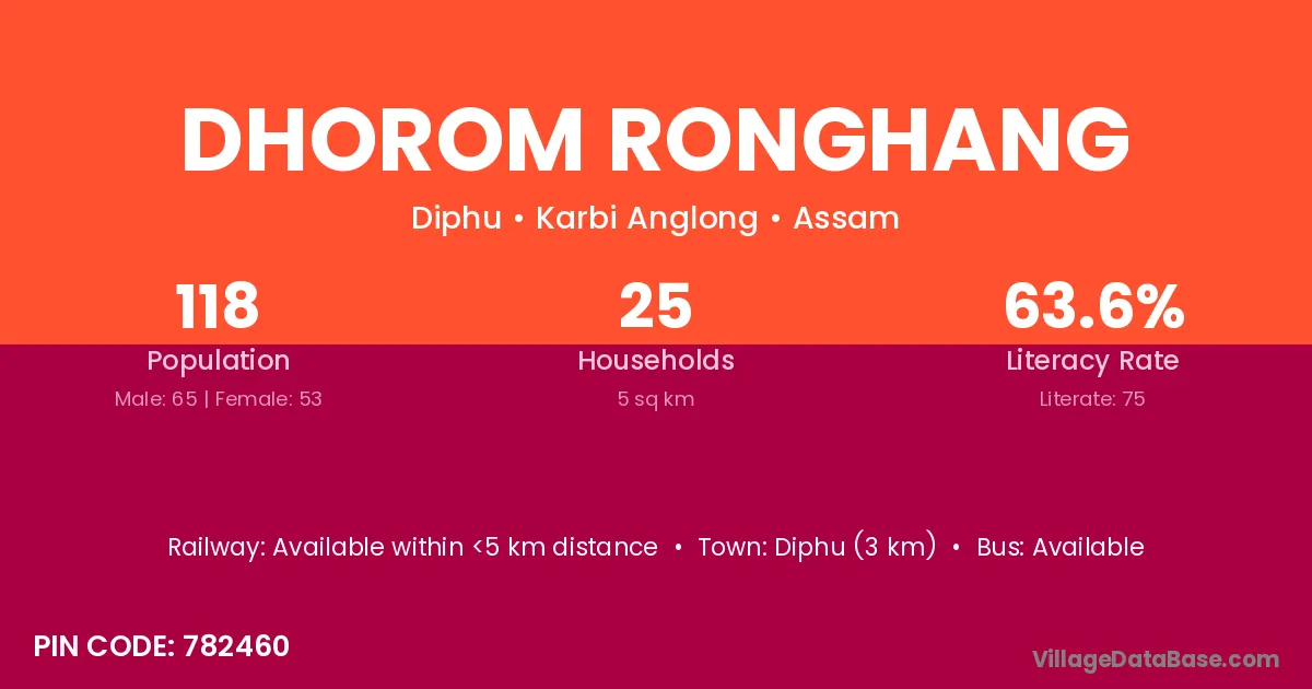 Diphu (3 km) is the nearest town to Dhorom Ronghang village for major economic activities and is located approximately 3 km away.