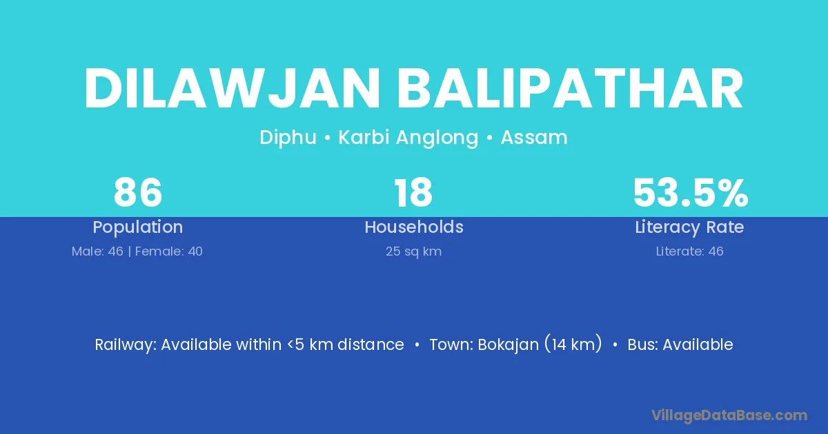 Bokajan (14 km) is the nearest town to Dilawjan Balipathar village for major economic activities and is located approximately 14 km away.