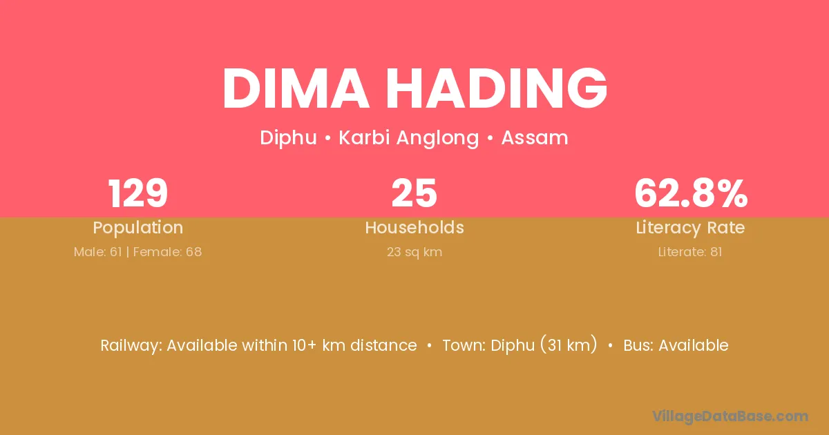 Diphu (31 km) is the nearest town to Dima Hading village for major economic activities and is located approximately 31 km away.