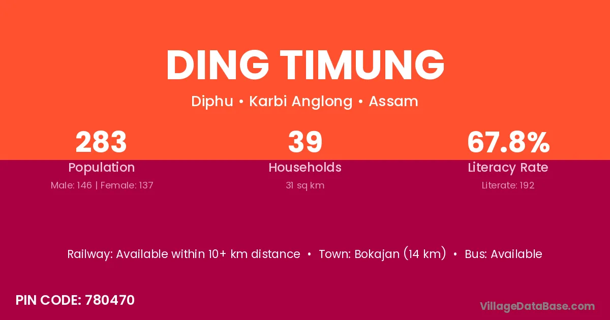 Bokajan (14 km) is the nearest town to Ding Timung village for major economic activities and is located approximately 14 km away.