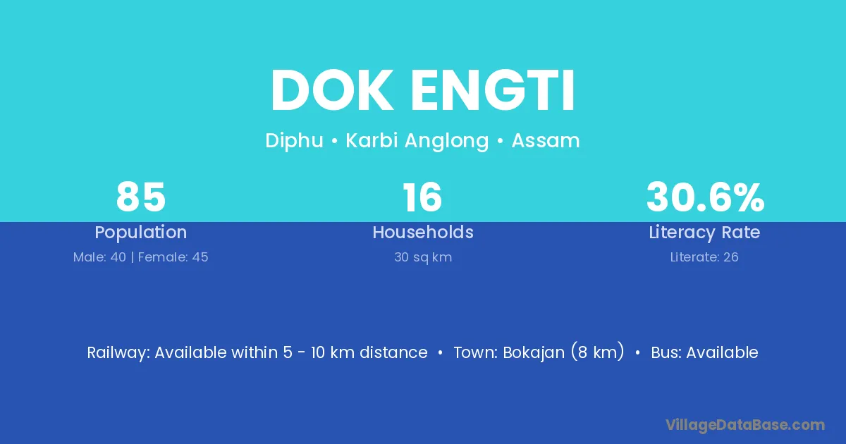 Bokajan (8 km) is the nearest town to Dok Engti village for major economic activities and is located approximately 8 km away.