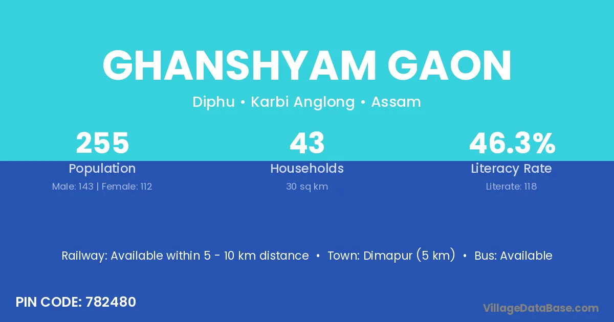 Ghanshyam Gaon village has a total population of 255 people, of which 143 are males and 112 are females.