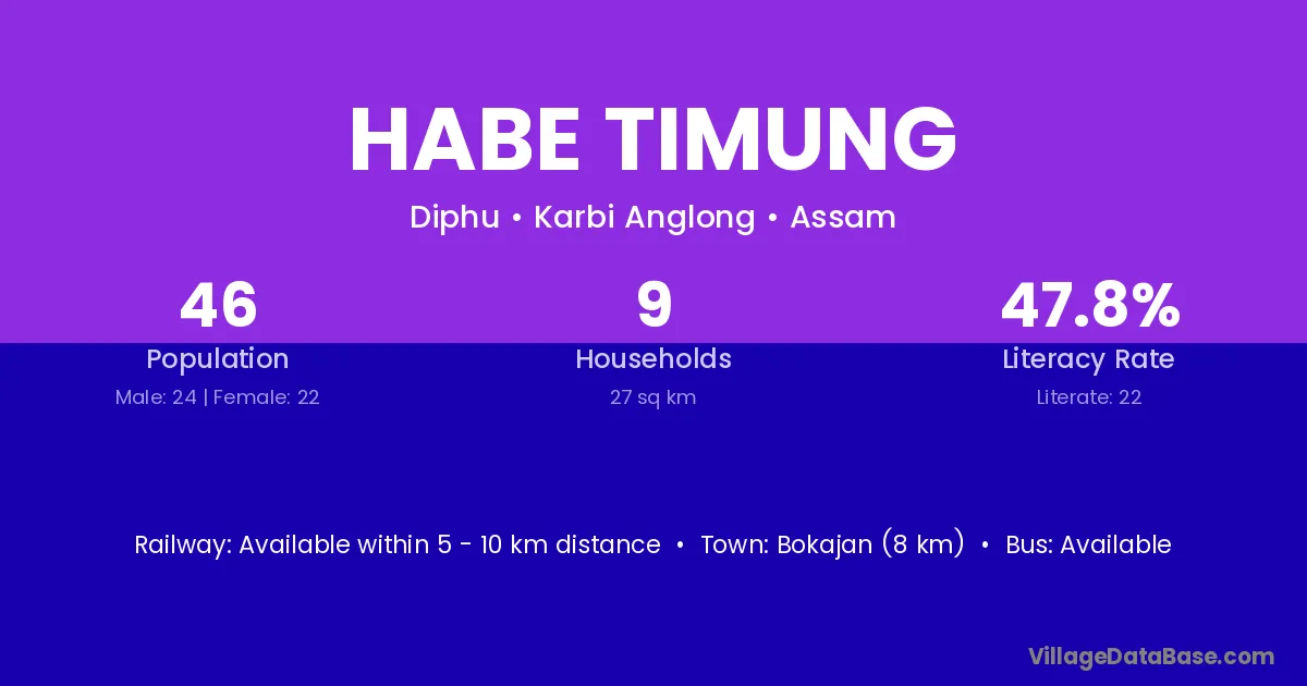 Bokajan (8 km) is the nearest town to Habe Timung village for major economic activities and is located approximately 8 km away.