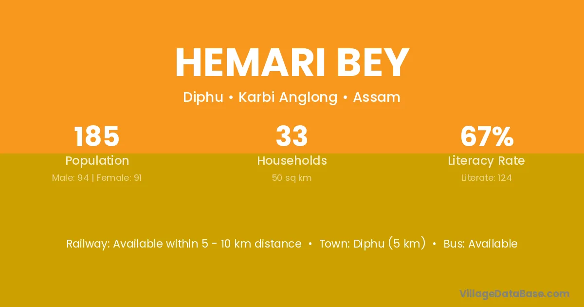 Diphu (5 km) is the nearest town to Hemari Bey village for major economic activities and is located approximately 5 km away.