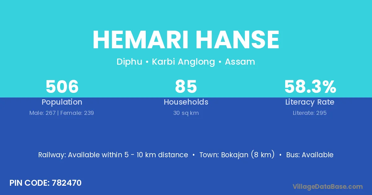 Bokajan (8 km) is the nearest town to Hemari Hanse village for major economic activities and is located approximately 8 km away.
