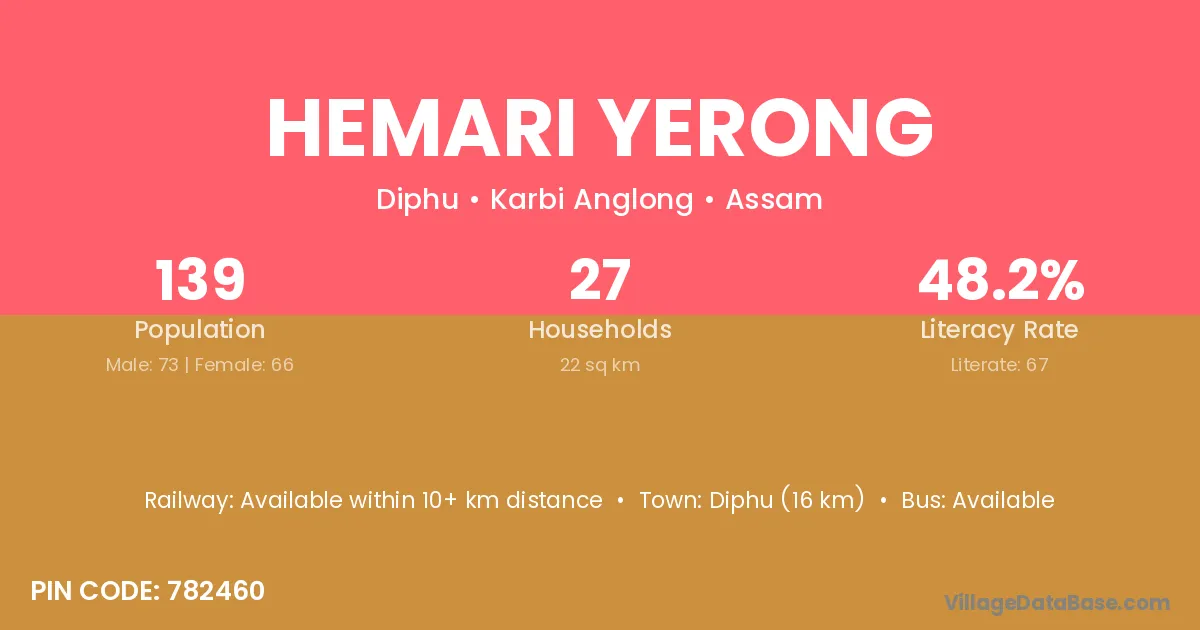 Diphu (16 km) is the nearest town to Hemari Yerong village for major economic activities and is located approximately 16 km away.
