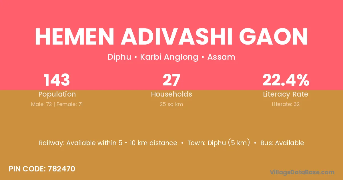 Diphu (5 km) is the nearest town to Hemen Adivashi Gaon village for major economic activities and is located approximately 5 km away.