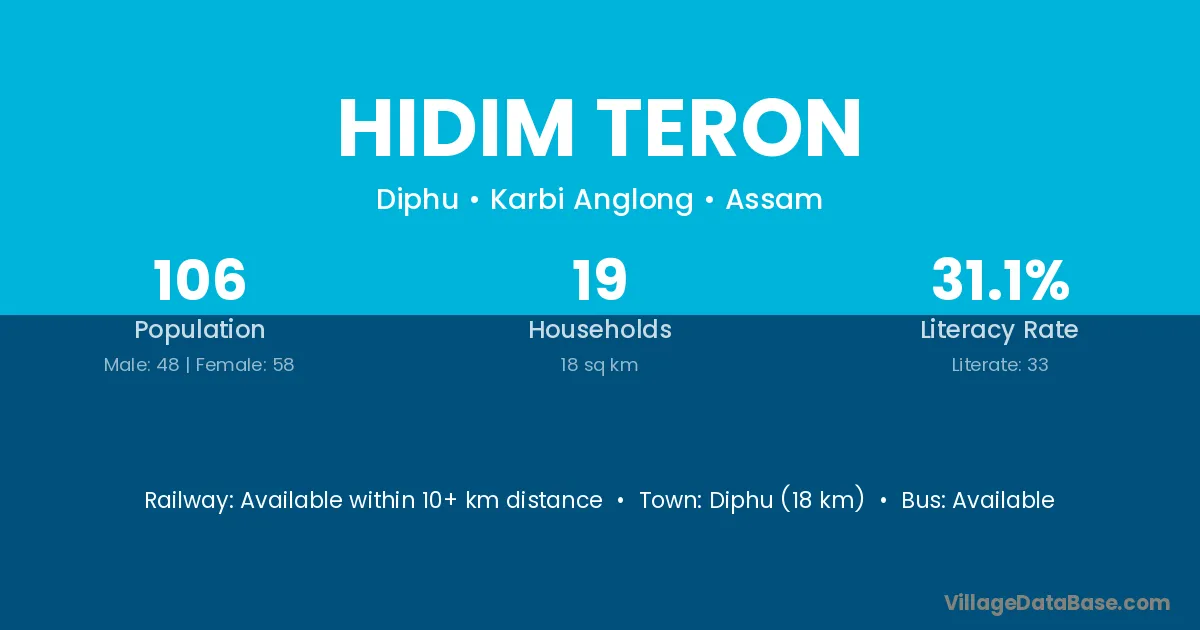 Diphu (18 km) is the nearest town to Hidim Teron village for major economic activities and is located approximately 18 km away.
