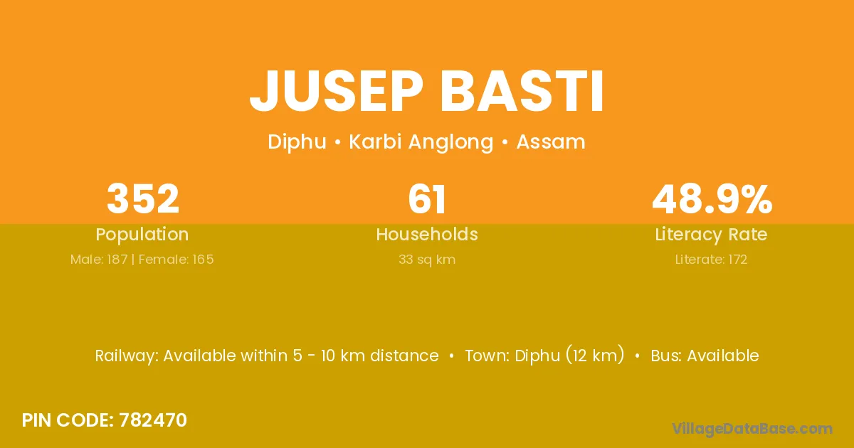 Diphu (12 km) is the nearest town to Jusep Basti village for major economic activities and is located approximately 12 km away.