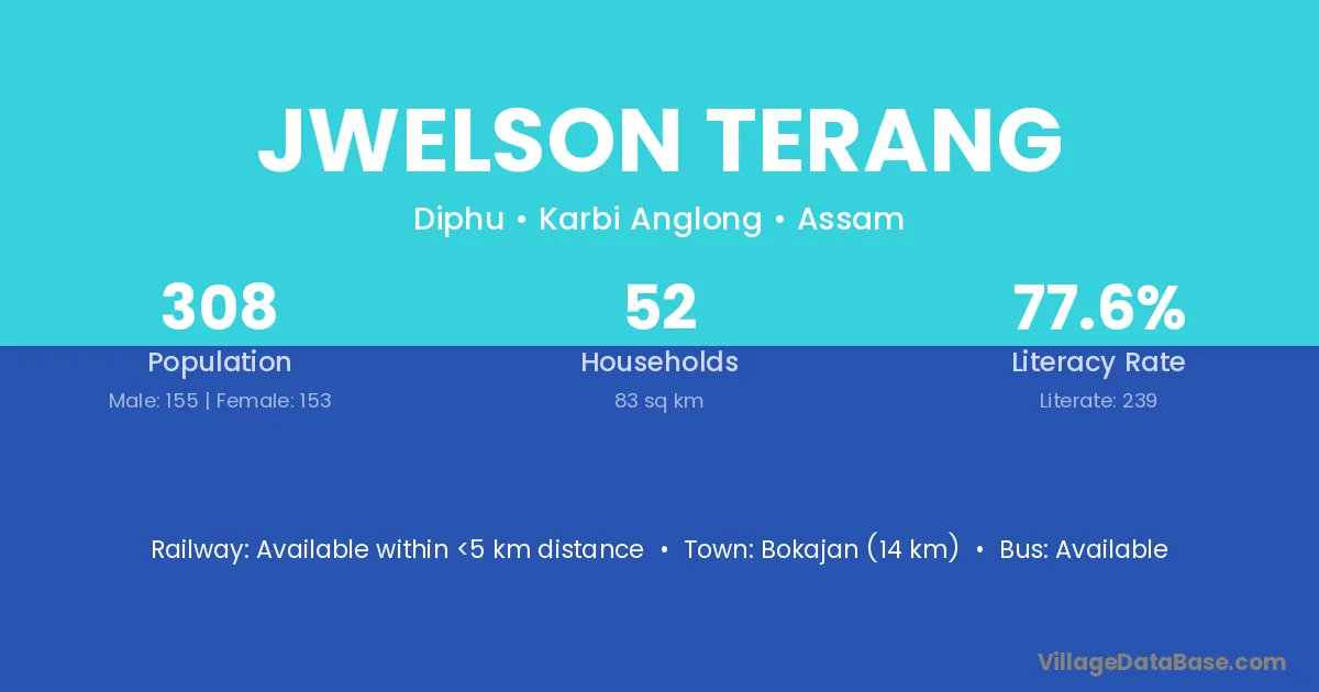 Bokajan (14 km) is the nearest town to Jwelson Terang village for major economic activities and is located approximately 14 km away.