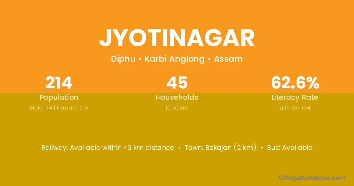 Bokajan (2 km) is the nearest town to Jyotinagar village for major economic activities and is located approximately 2 km away.