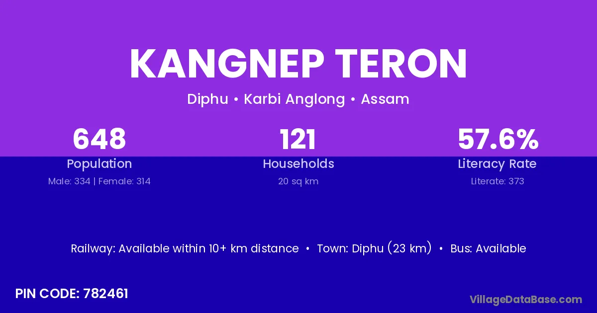 Diphu (23 km) is the nearest town to Kangnep Teron village for major economic activities and is located approximately 23 km away.