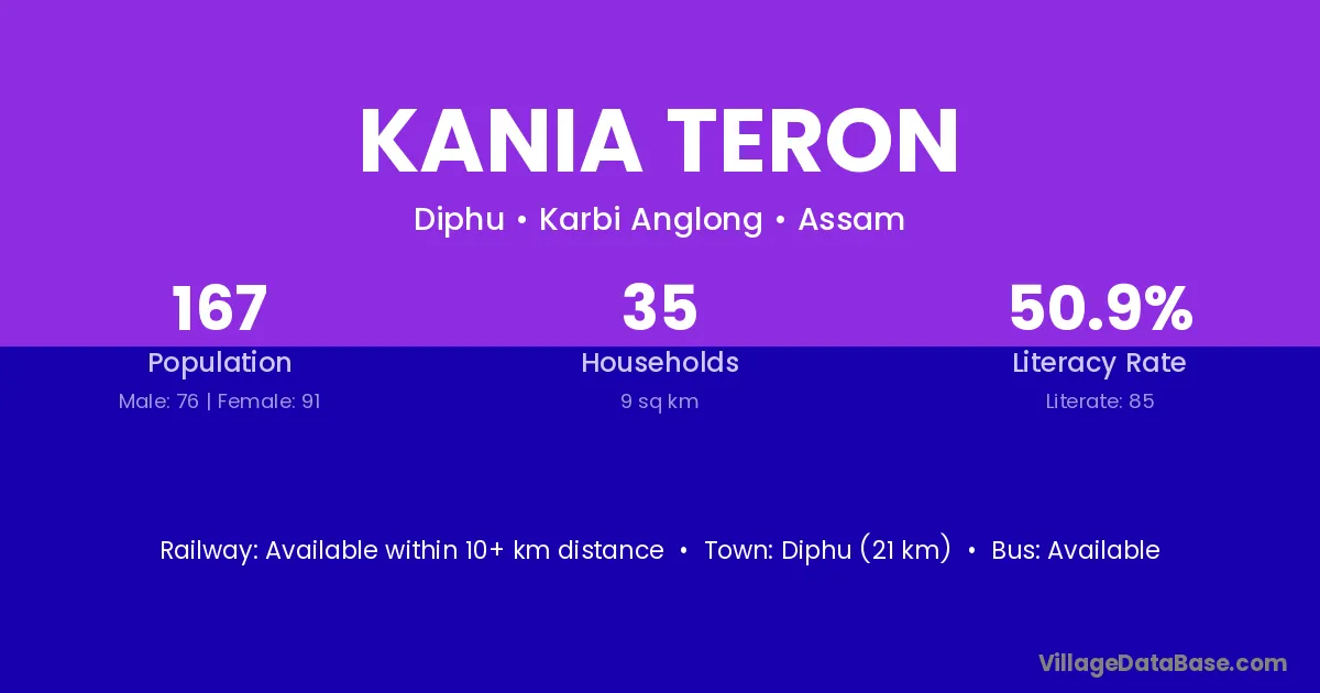 Diphu (21 km) is the nearest town to Kania Teron village for major economic activities and is located approximately 21 km away.