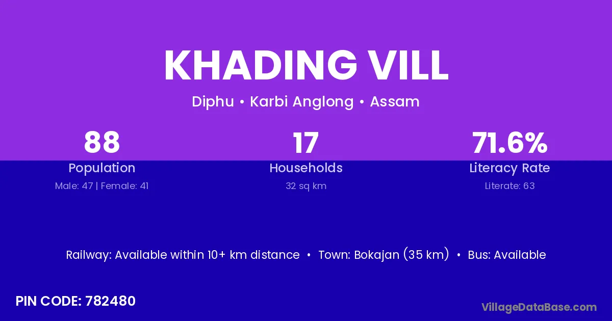 Bokajan (35 km) is the nearest town to Khading Vill village for major economic activities and is located approximately 35 km away.