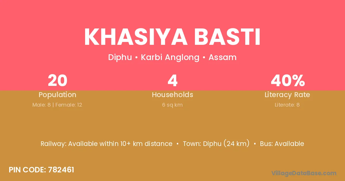Khasiya Basti village has a total population of 20 people, of which 8 are males and 12 are females.