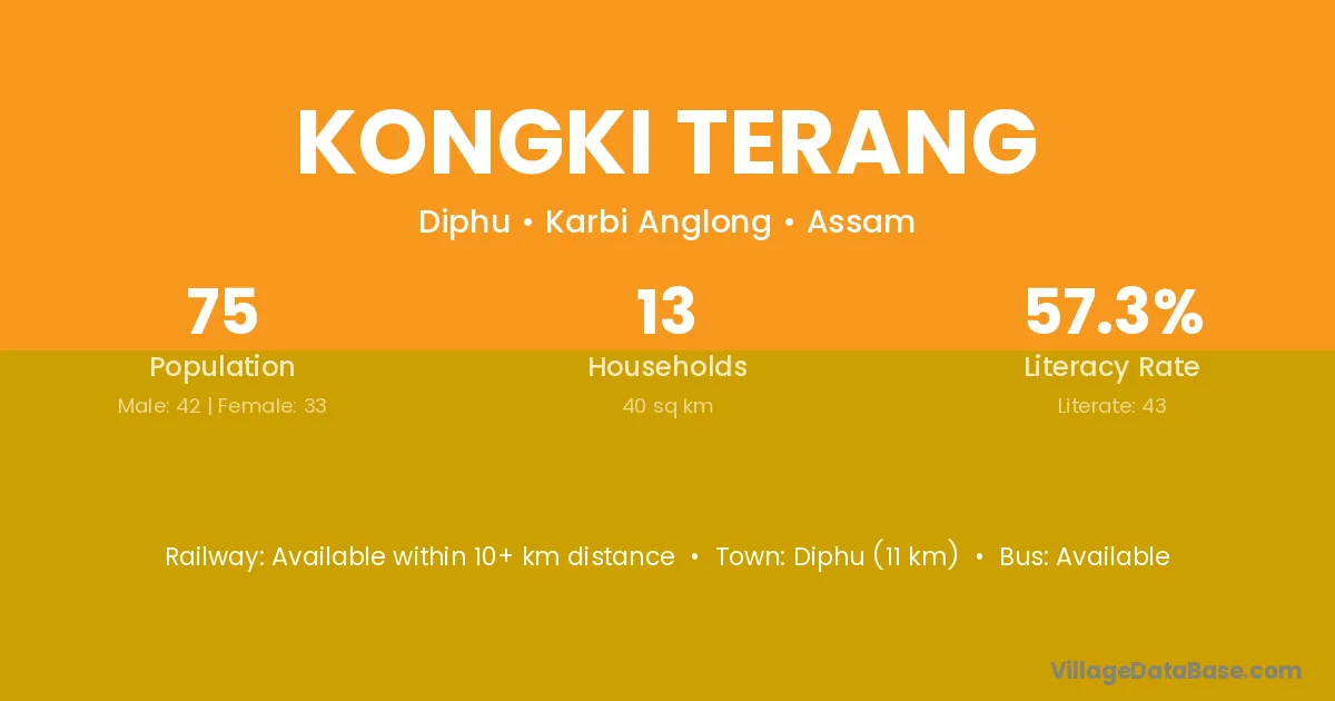 Diphu (11 km) is the nearest town to Kongki Terang village for major economic activities and is located approximately 11 km away.