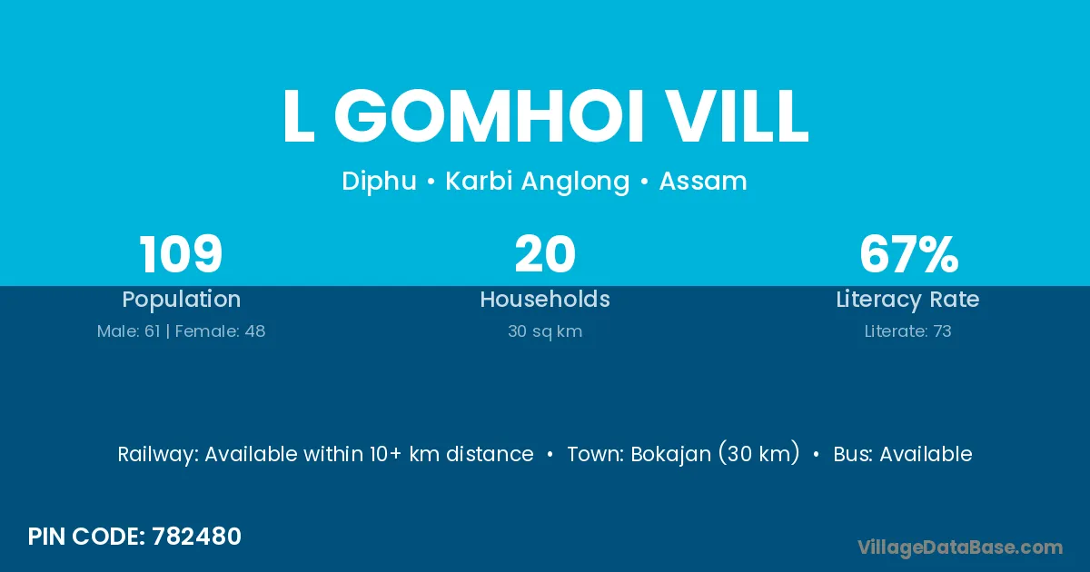 Bokajan (30 km) is the nearest town to L Gomhoi Vill village for major economic activities and is located approximately 30 km away.
