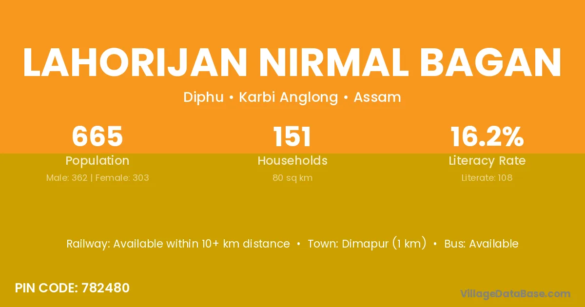 Dimapur (1 km) is the nearest town to Lahorijan Nirmal Bagan village for major economic activities and is located approximately 1 km away.