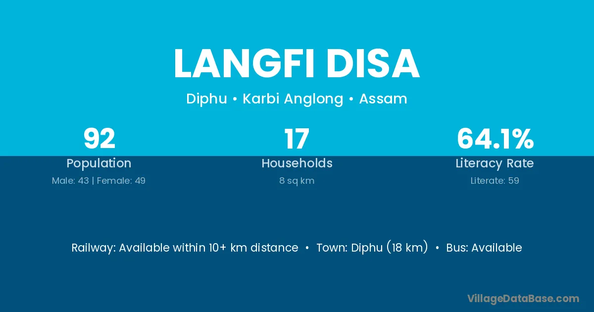 Diphu (18 km) is the nearest town to Langfi Disa village for major economic activities and is located approximately 18 km away.