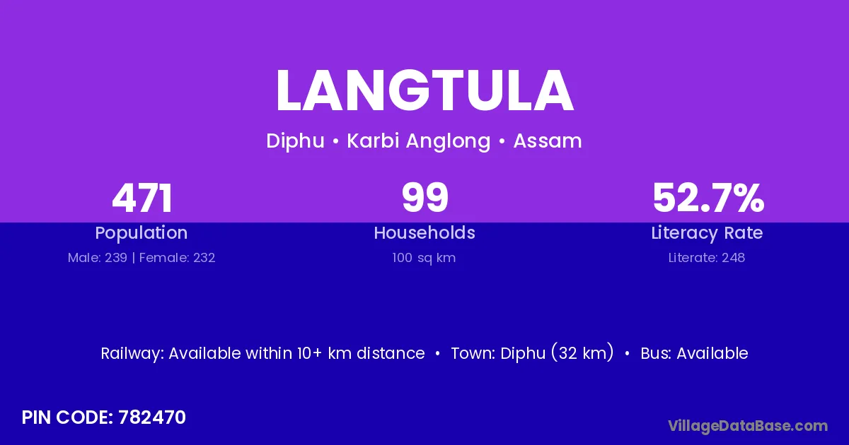 Diphu (32 km) is the nearest town to Langtula village for major economic activities and is located approximately 32 km away.