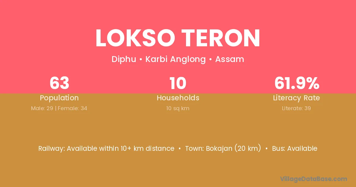 Bokajan (20 km) is the nearest town to Lokso Teron village for major economic activities and is located approximately 20 km away.