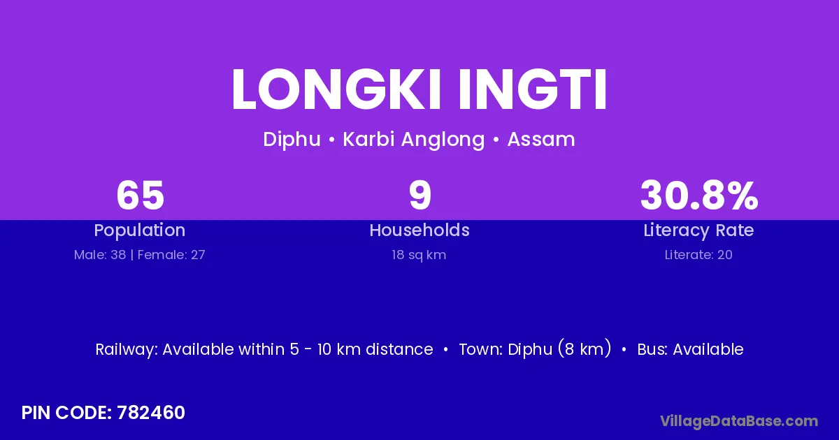 Diphu (8 km) is the nearest town to Longki Ingti village for major economic activities and is located approximately 8 km away.