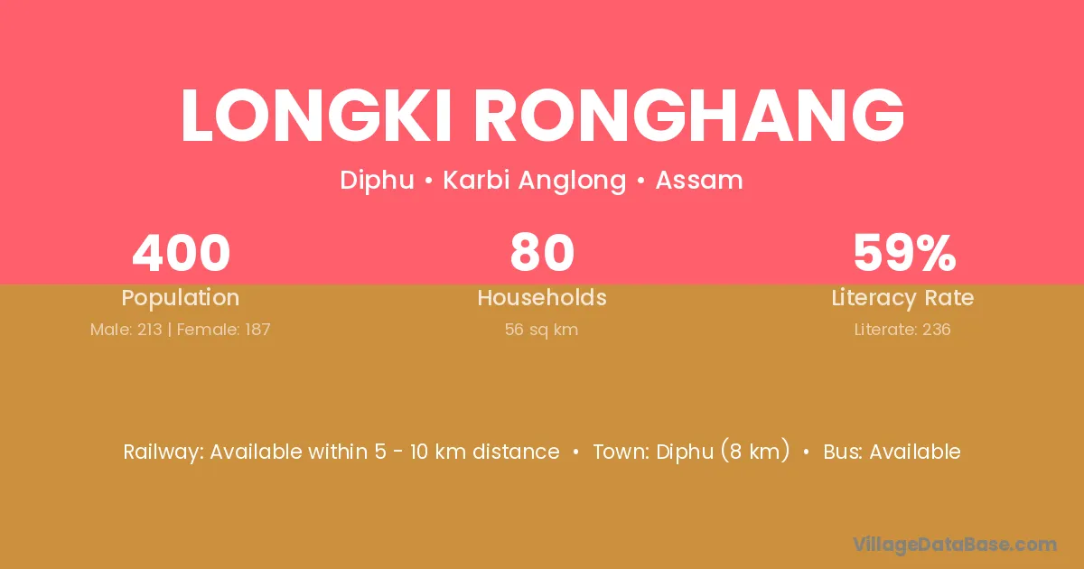 Diphu (8 km) is the nearest town to Longki Ronghang village for major economic activities and is located approximately 8 km away.