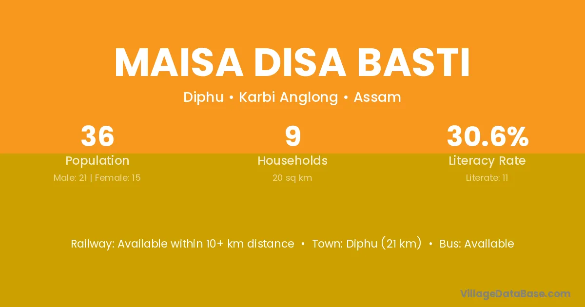 Diphu (21 km) is the nearest town to Maisa Disa Basti village for major economic activities and is located approximately 21 km away.