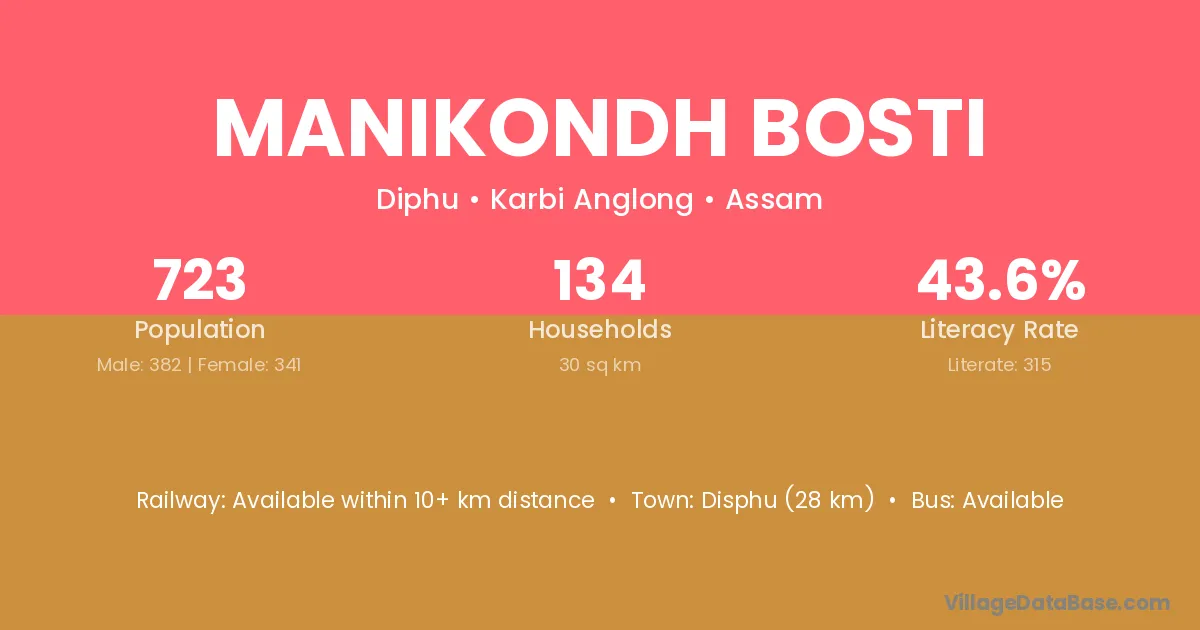 Disphu (28 km) is the nearest town to Manikondh Bosti village for major economic activities and is located approximately 28 km away.